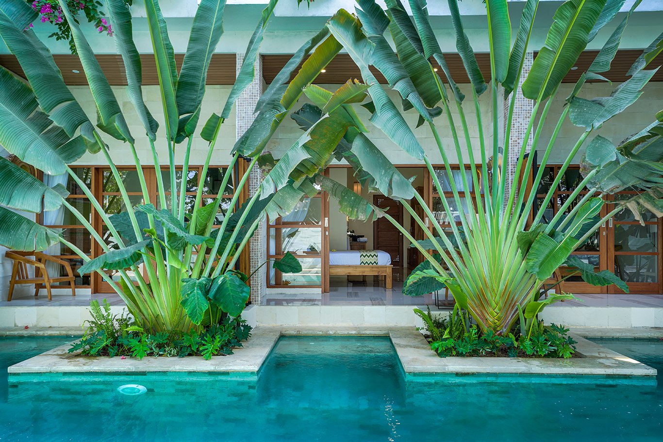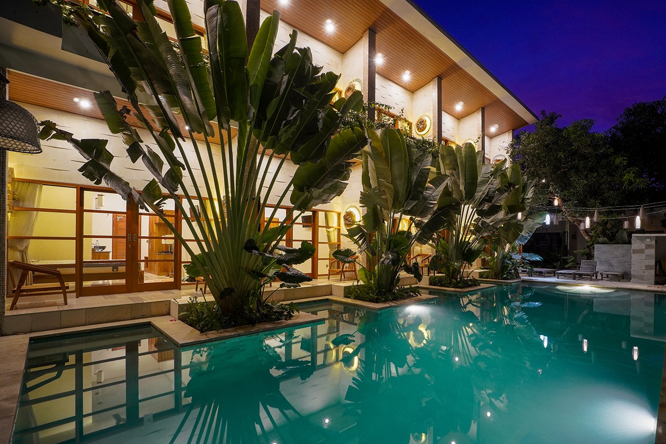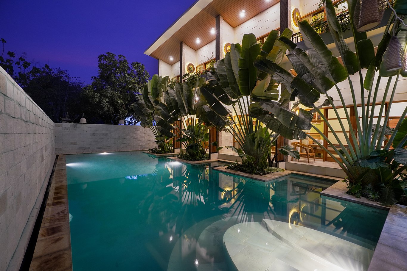 View of Maha Lokha Balangan swimming pool at night with big banana like trees in front of the pool access bedrooms