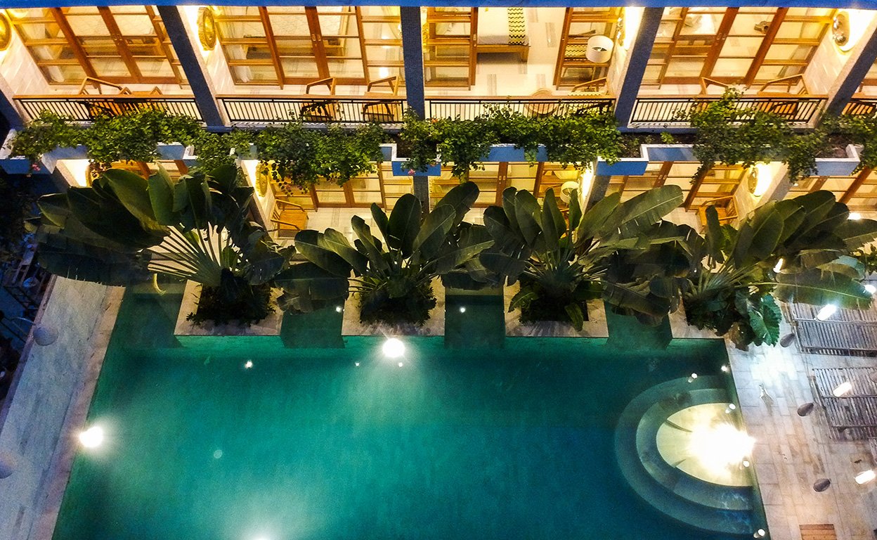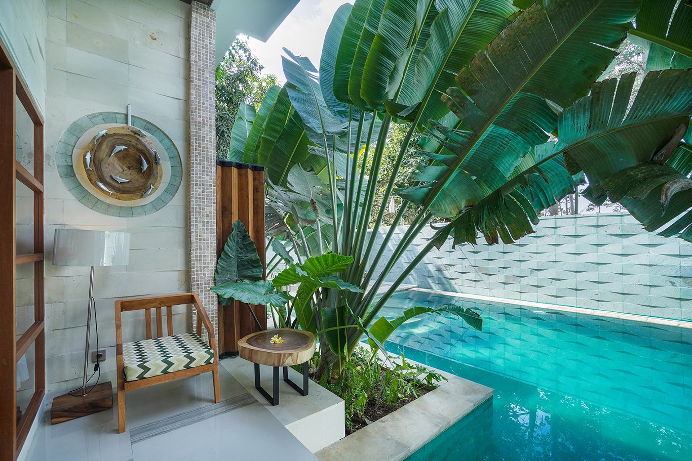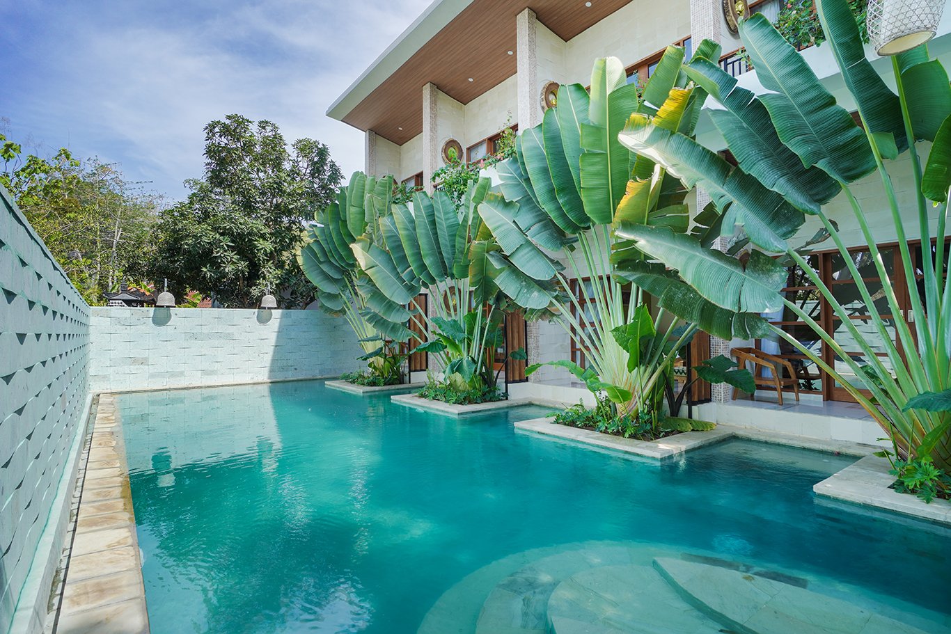 View of Maha Lokha Balangan swimming pool at night with big banana like trees in front of the pool access bedrooms