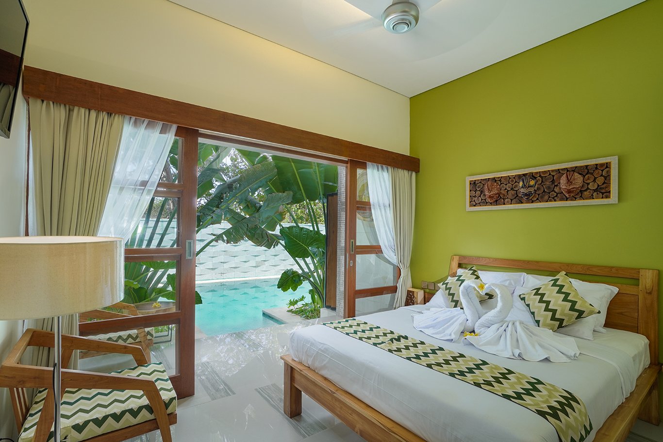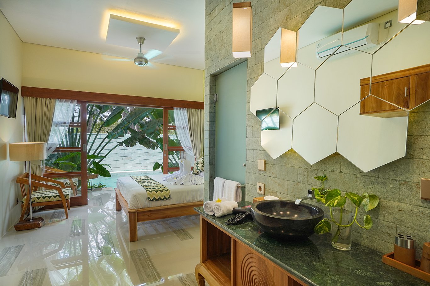 Maha Lokha has 5 bedrooms with pool view located on the upper floor. Each has the same configuration as the pool access bedroom below. On the picture is the set up for honeymooners.