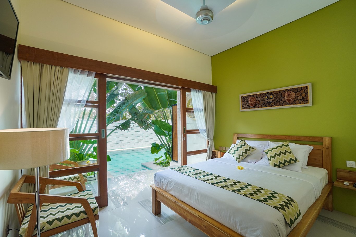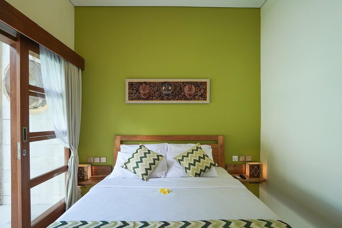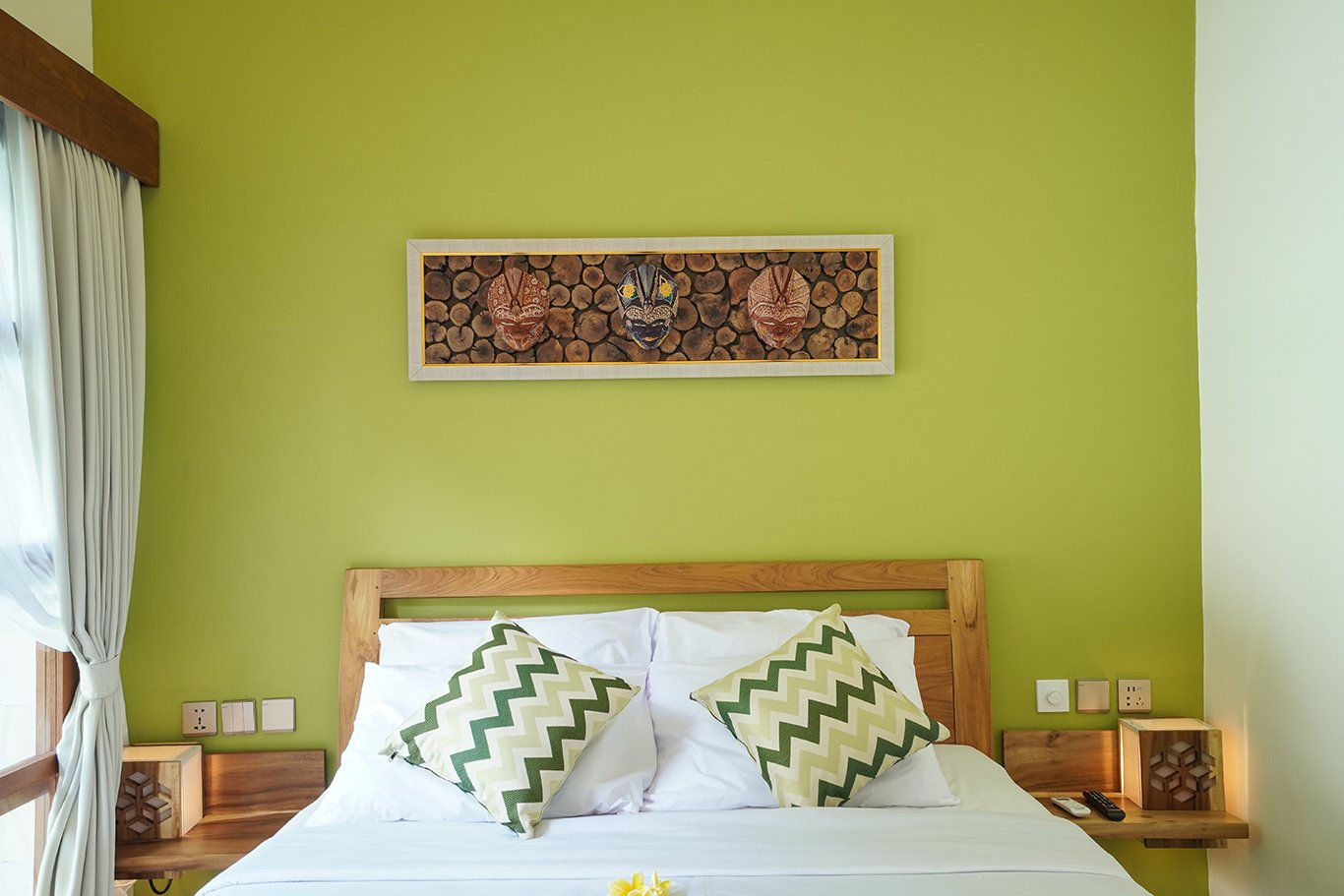 The bed wall has a green background paint with decoration made from small teak wood trees and java style mask.